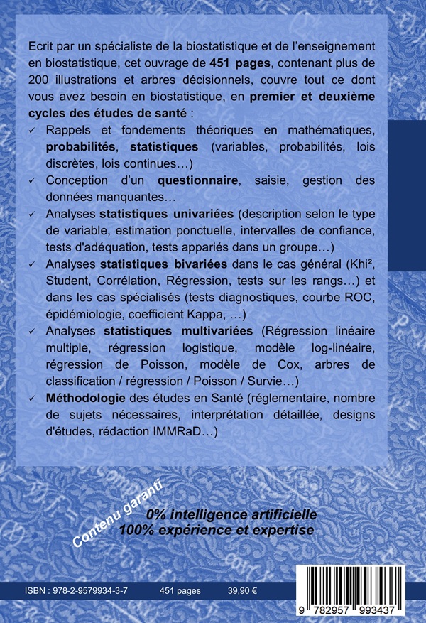 Ecrit par un spécialiste de la biostatistique et de l’enseignement en biostatistique, cet ouvrage de 451 pages, contenant plus de 200 illustrations et arbres décisionnels, couvre tout ce dont vous avez besoin en biostatistique, en premier et deuxième cycles des études de santé :